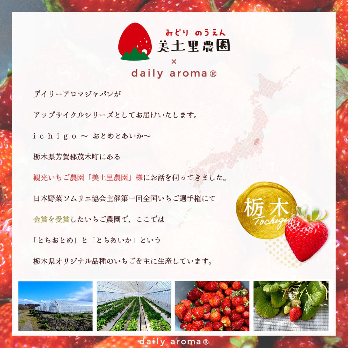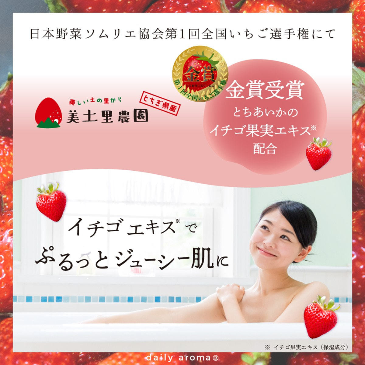 廃棄になってしまういちごから独自に美容成分「栃木イチゴ果実エキス*1」を抽出配合。