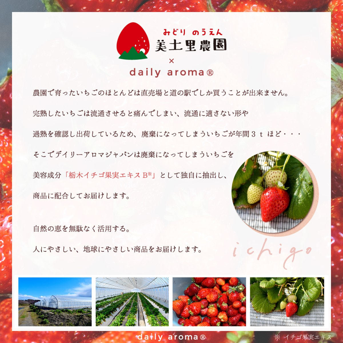 廃棄になってしまういちごから独自に美容成分「栃木イチゴ果実エキス※2」を抽出配合。
